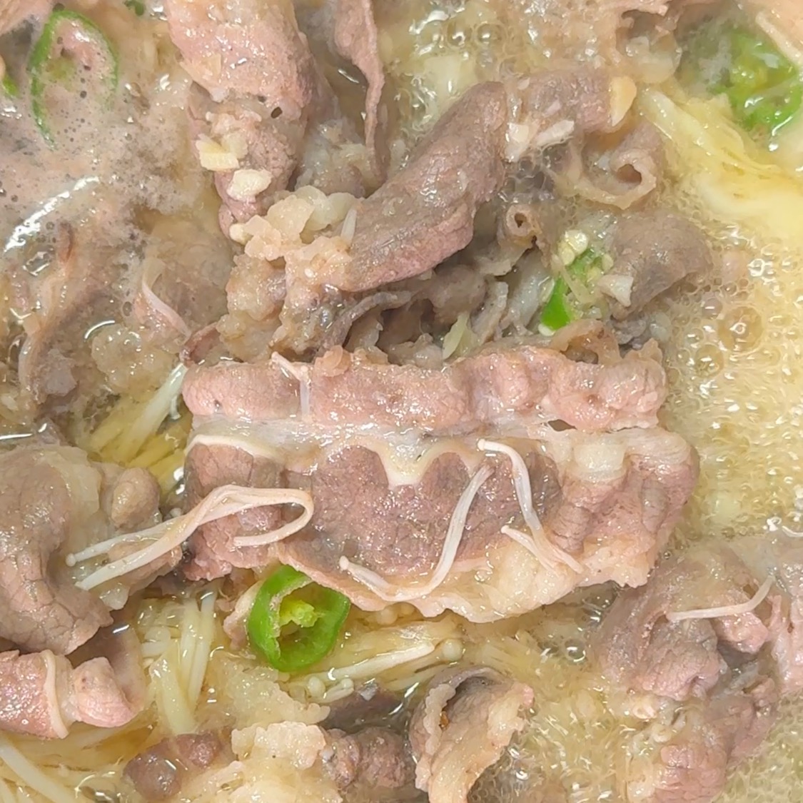 2️⃣ 그 위에 팽이버섯 → 고기 순서로 차곡차곡 얹어요.