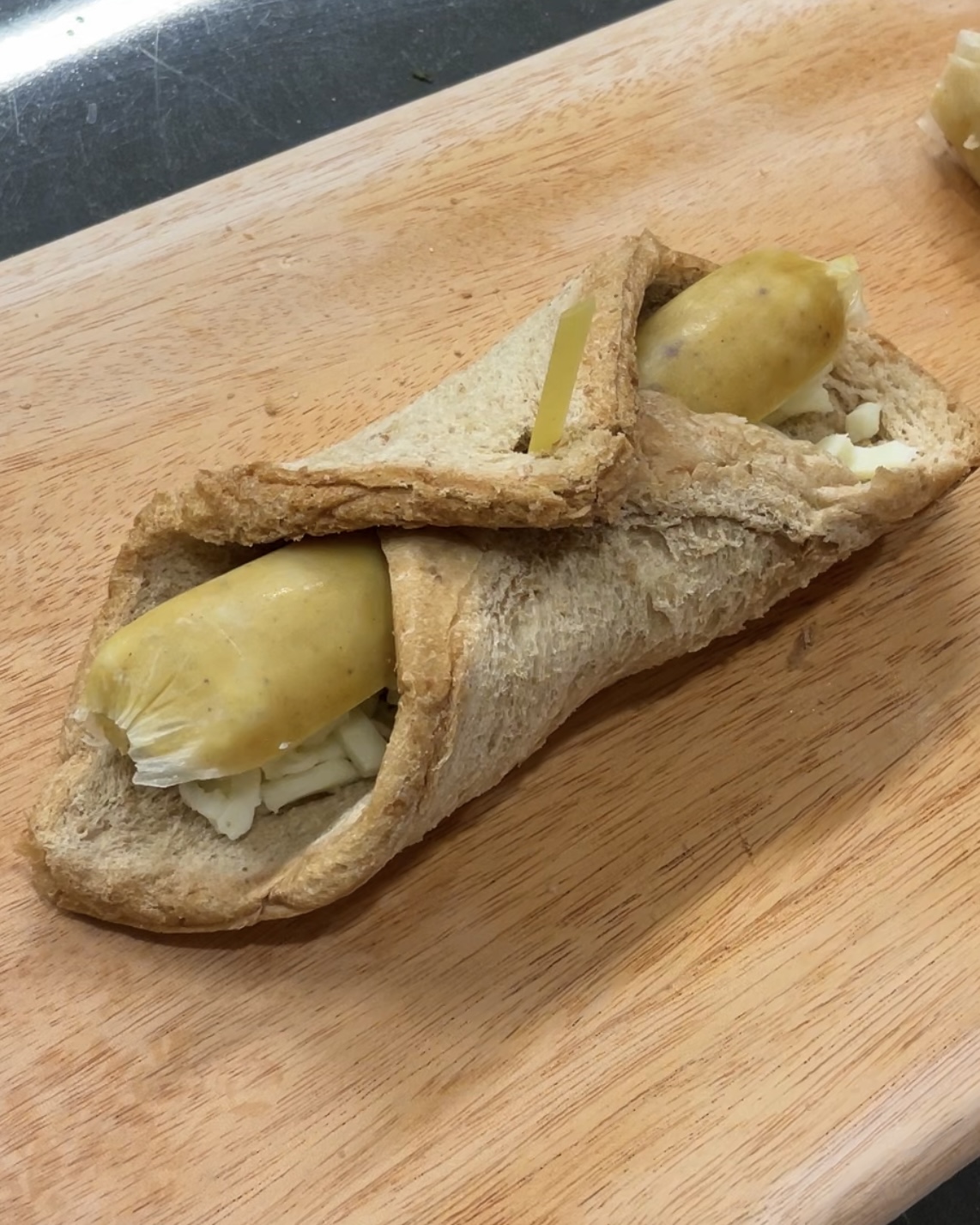 5. 식빵을 반으로 접어서 파스타면이나 이쑤시개로 고정시켜준다.