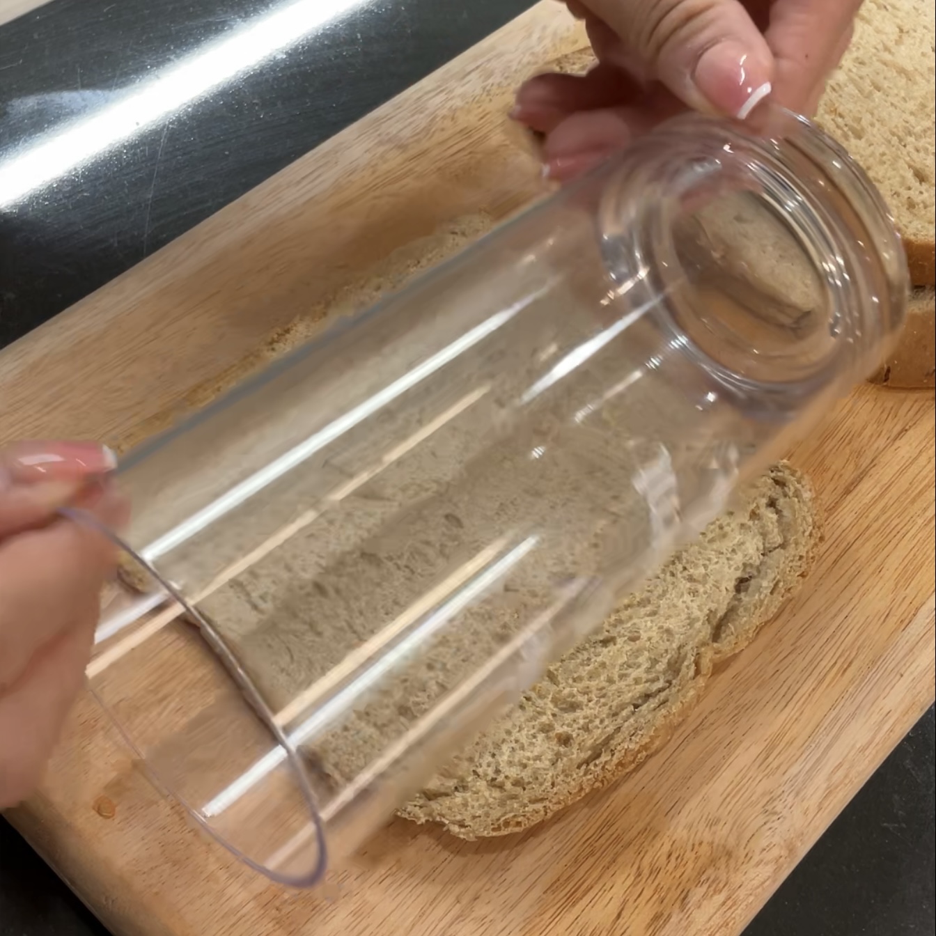 1. 통밀식빵을 긴 컵이나 밀대로 꾹꾹 눌러서 납작하게
