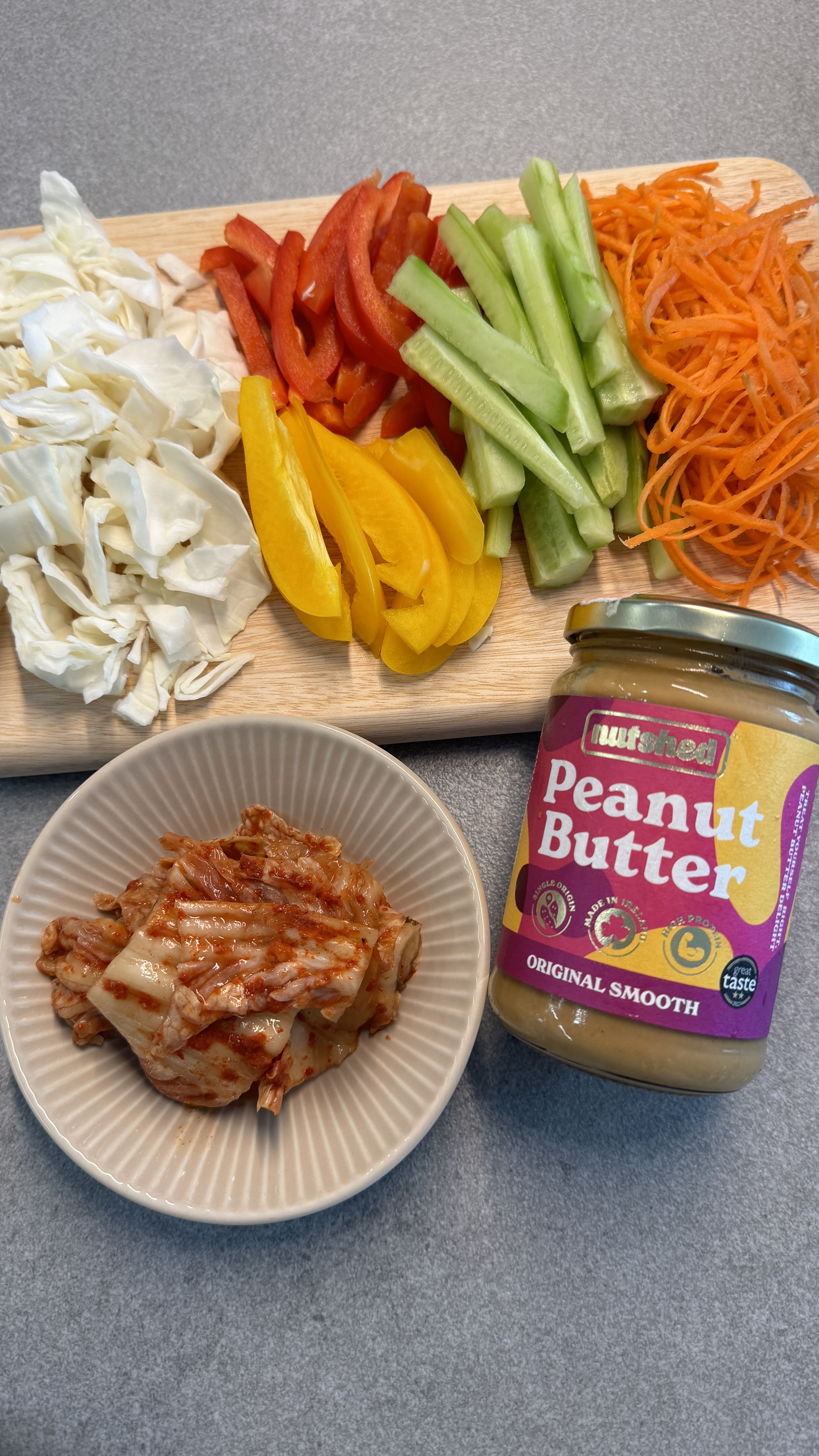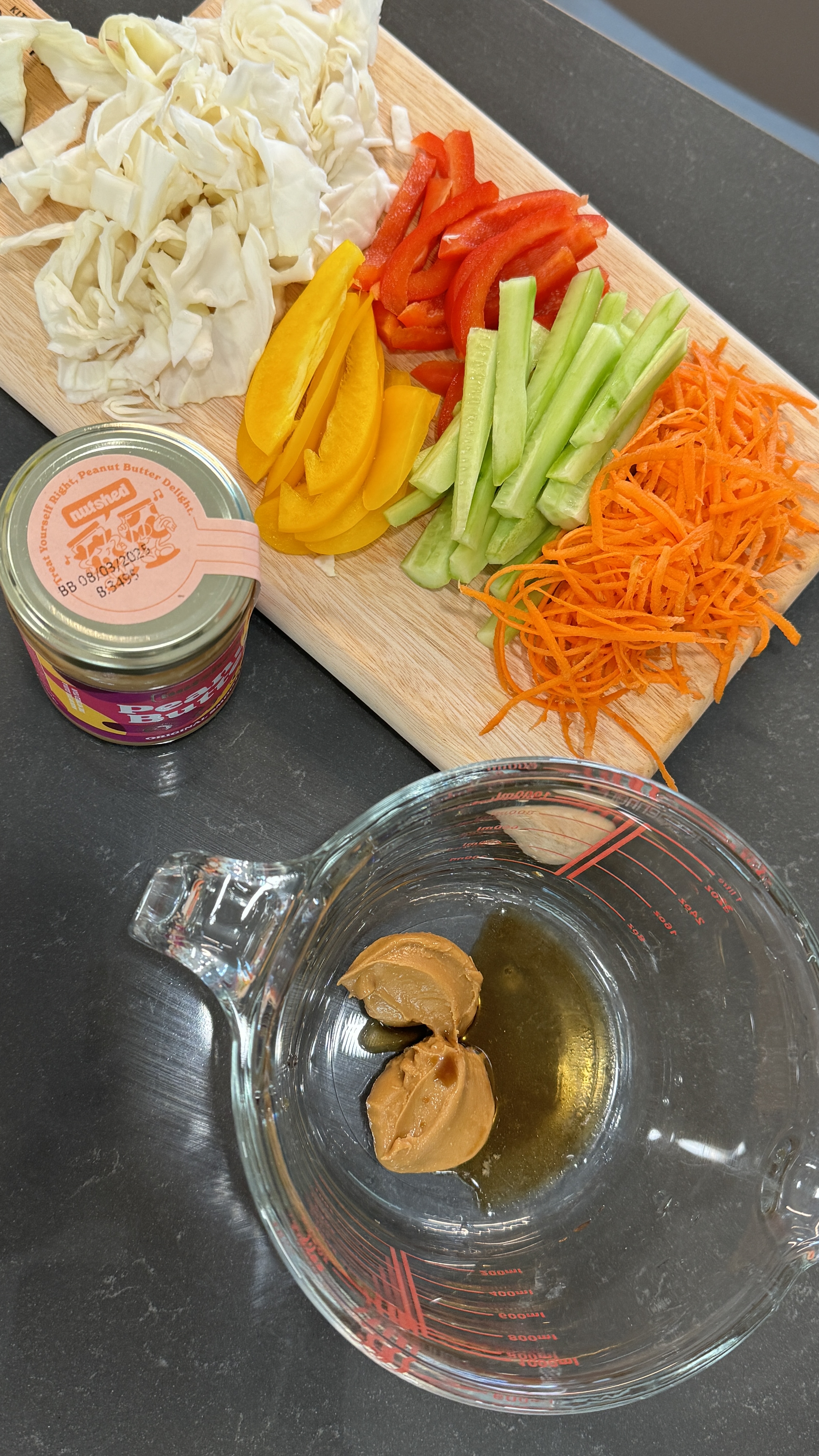 땅콩버터 2스푼, 양배추 1/4개, 당근 1/3개