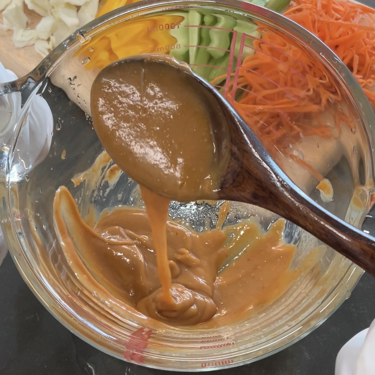 땅콩버터 2스푼, 식초 반스푼, 간장 반스푼도 따로 넣어준다.