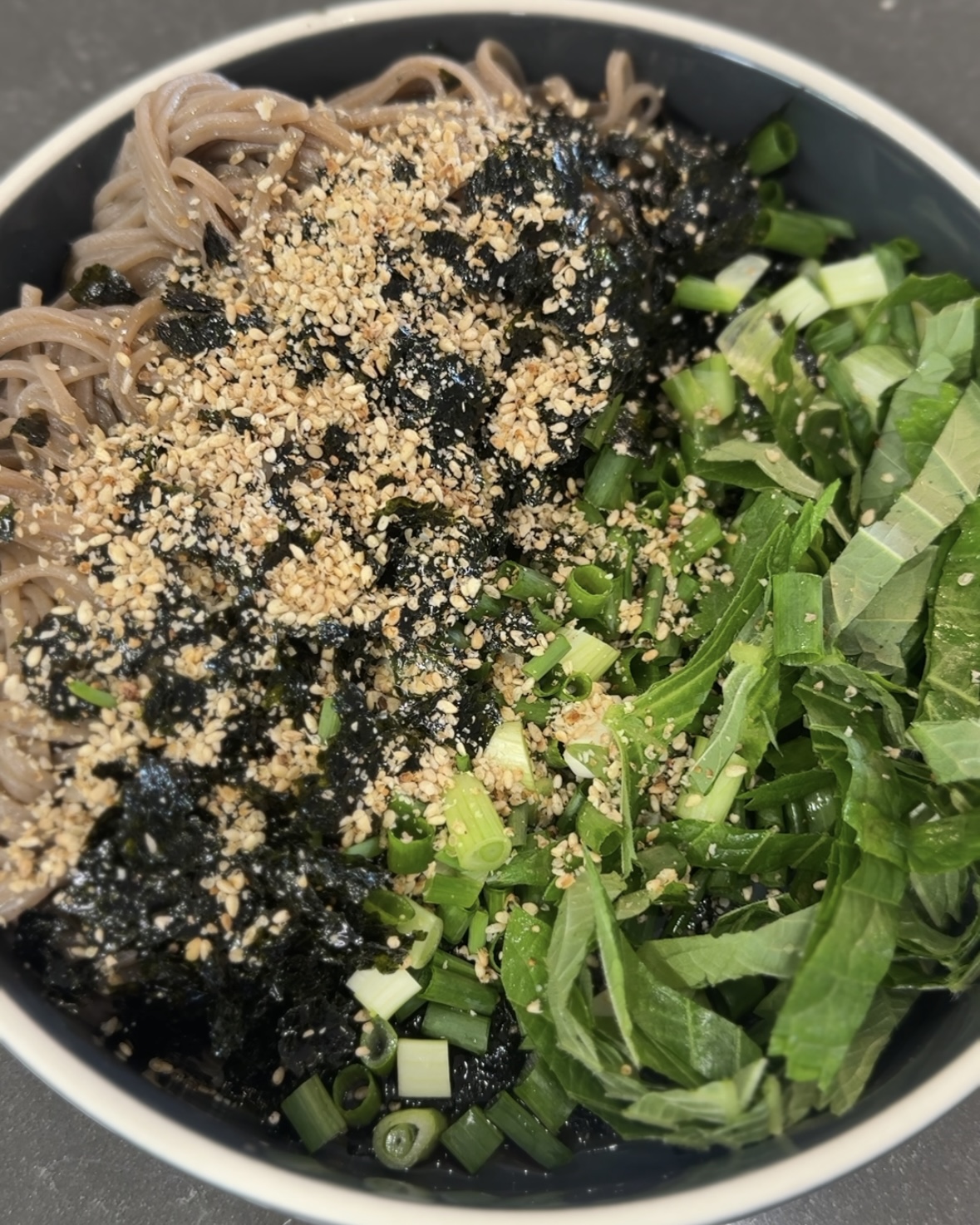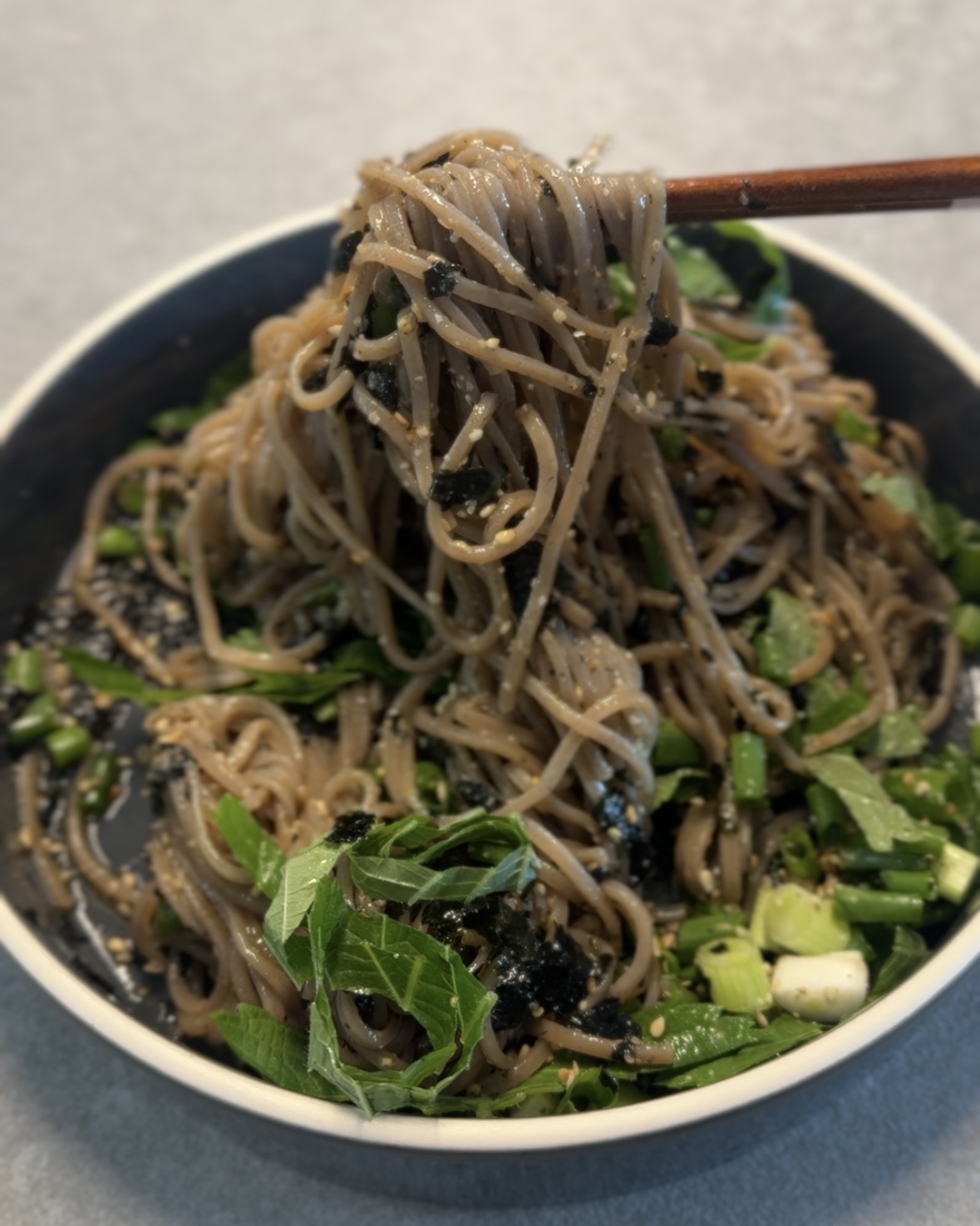 메밀면 80g, 쪽파 큰거 1-2개, 깻잎 3장