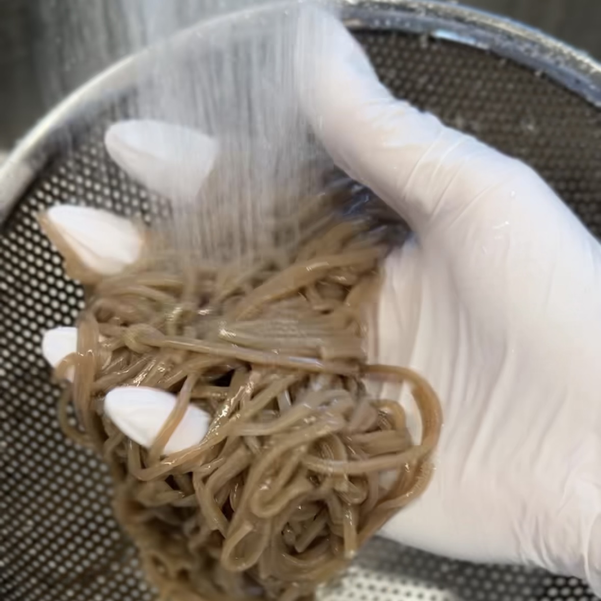 찬물에 메밀면의 전분기가 없어질 정도로 세척한다.