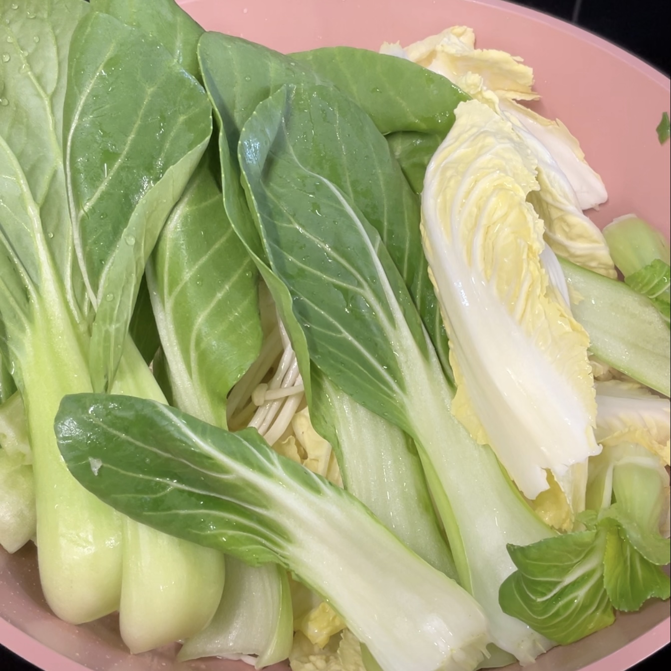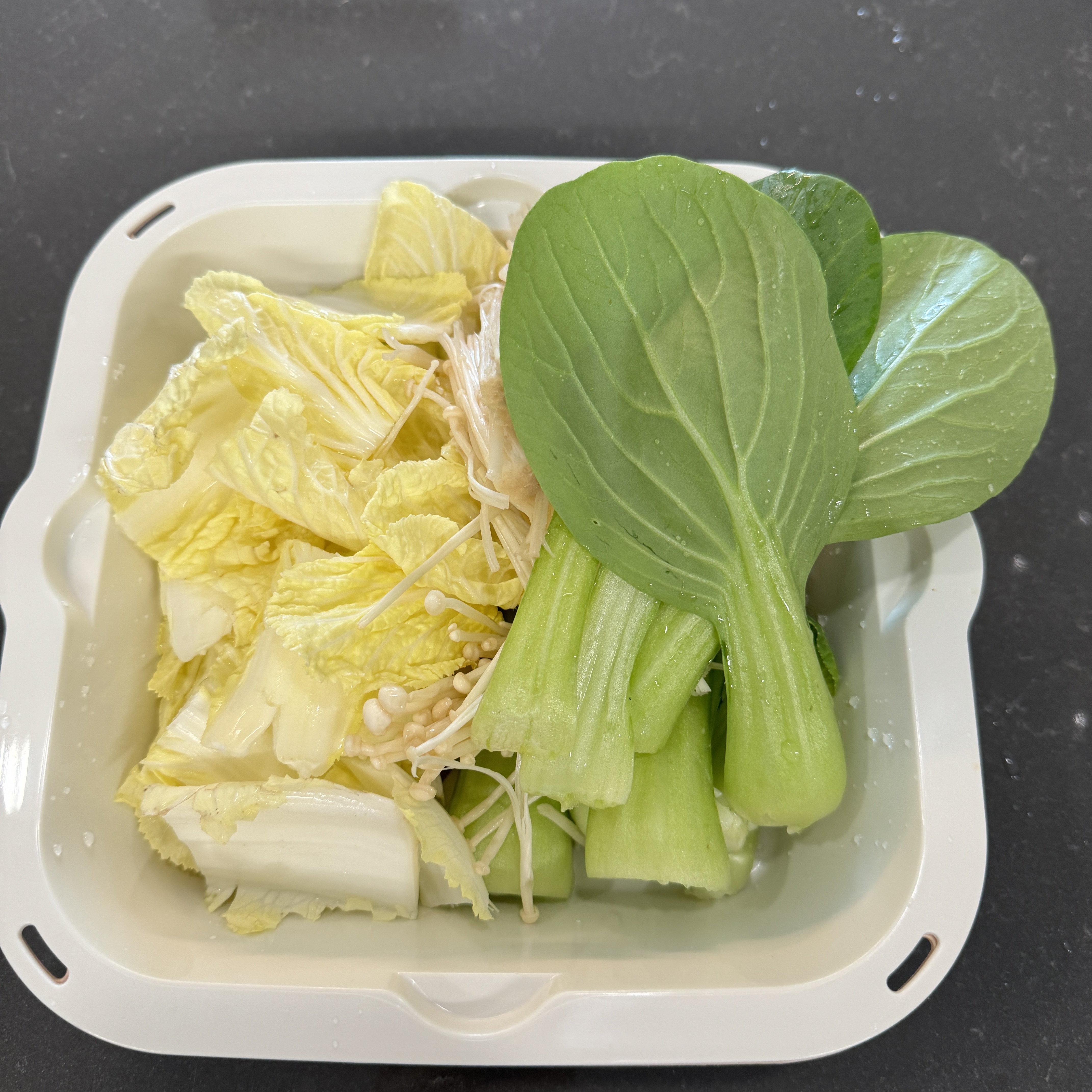 1. 배추 3장, 팽이버섯 300g은 가위로 먹기 좋게 잘라준다.