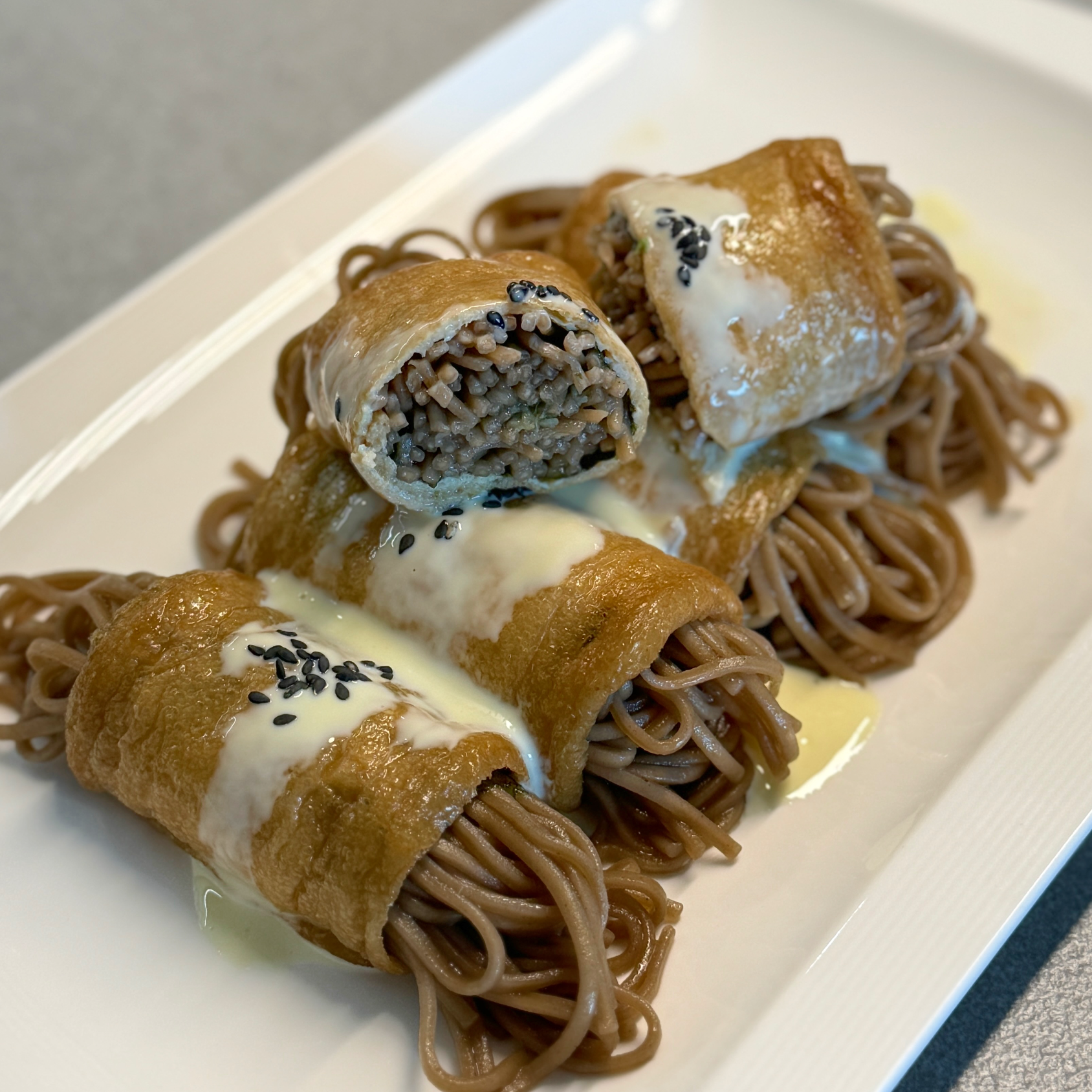 그 위에 양념된 메밀을 올려서 돌돌 말아준다.