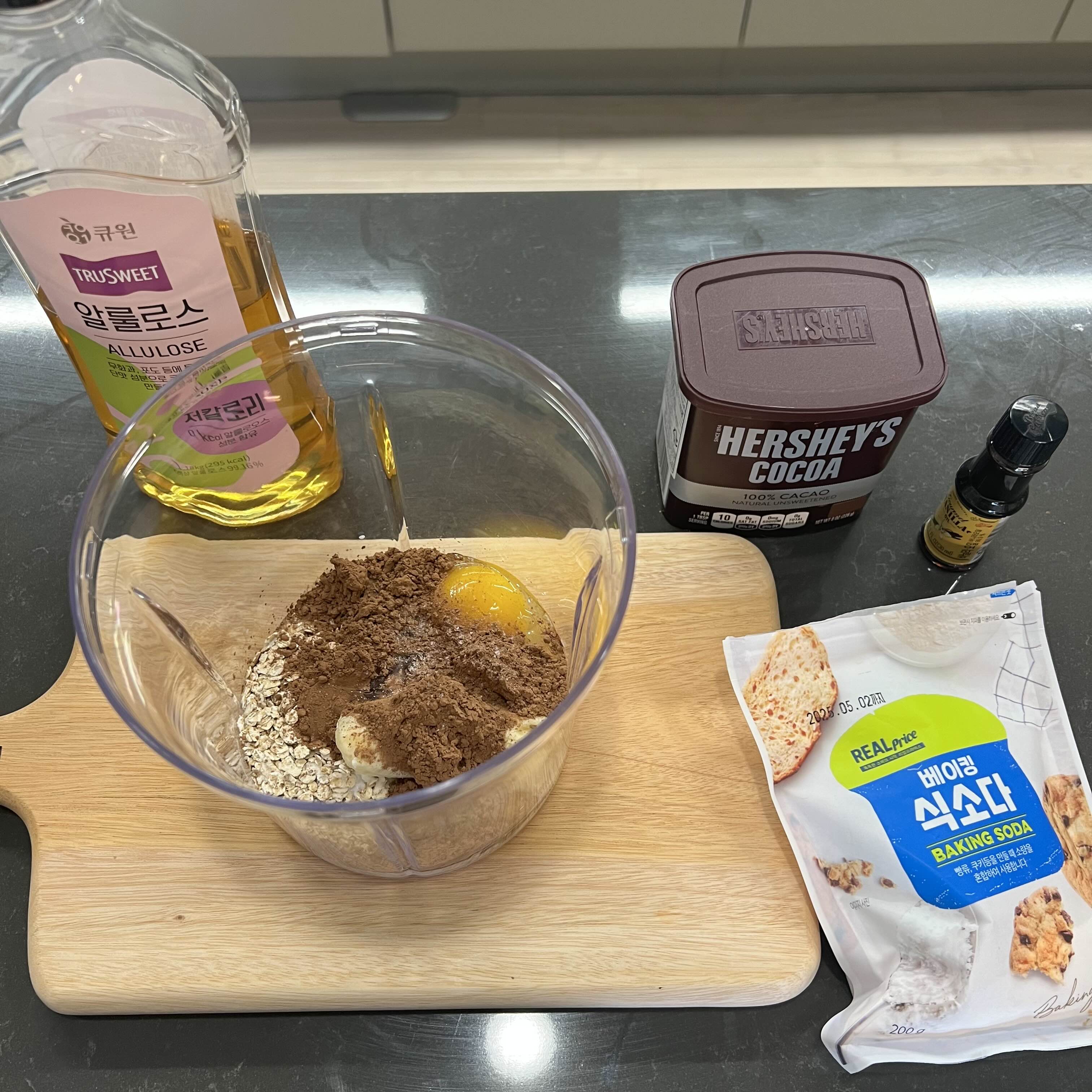 코코아 파우더 2스푼, 알룰로스 1스푼, 바닐라 오일 0.5스푼을 넣고