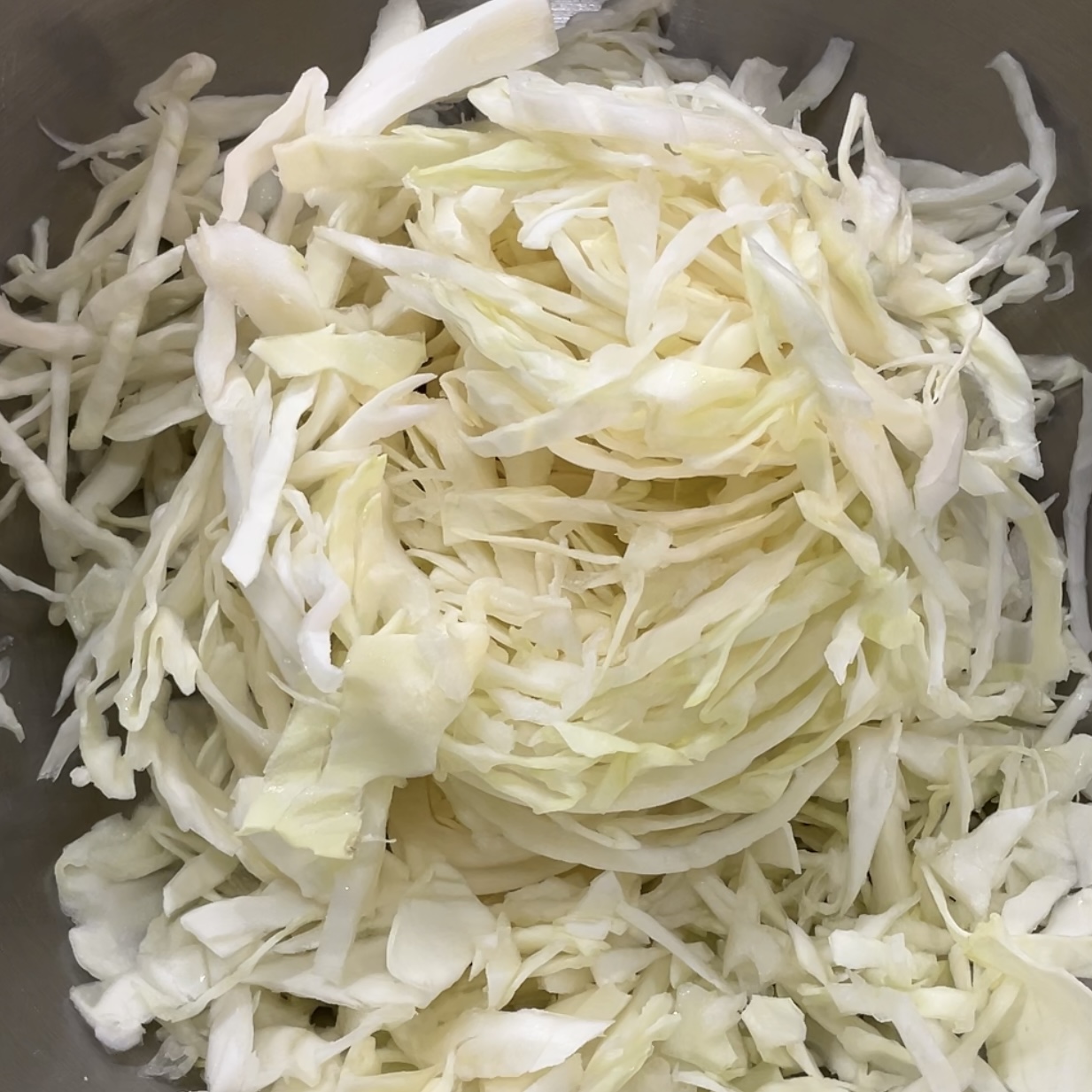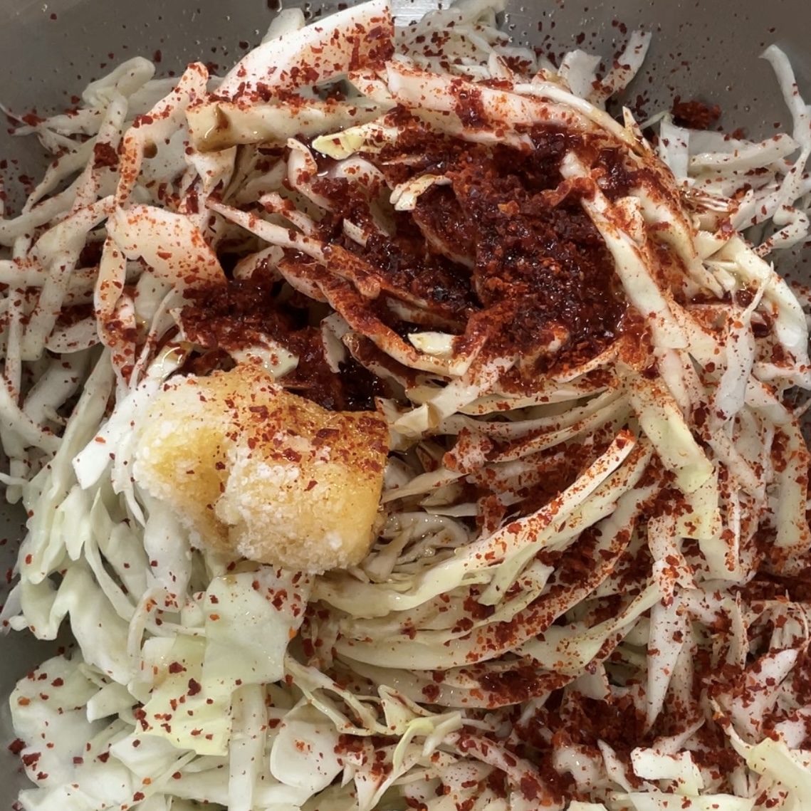 양배추 1/4개 (두 줌), 다진마늘, 고춧가루, 식초