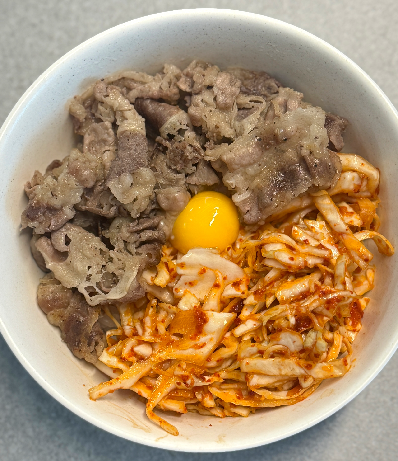 5.밥 100g 위에 양배추, 고기를 올려줍니다.