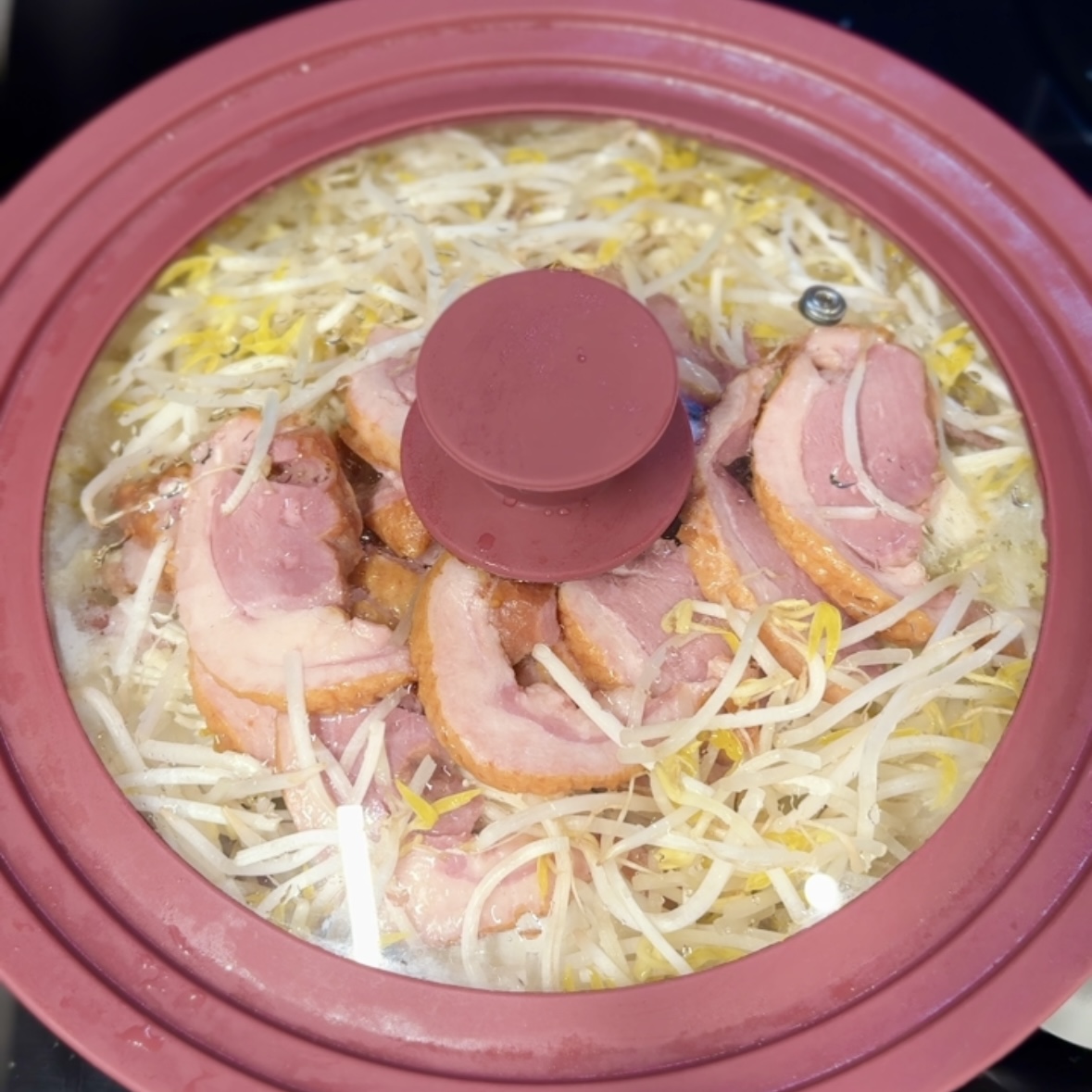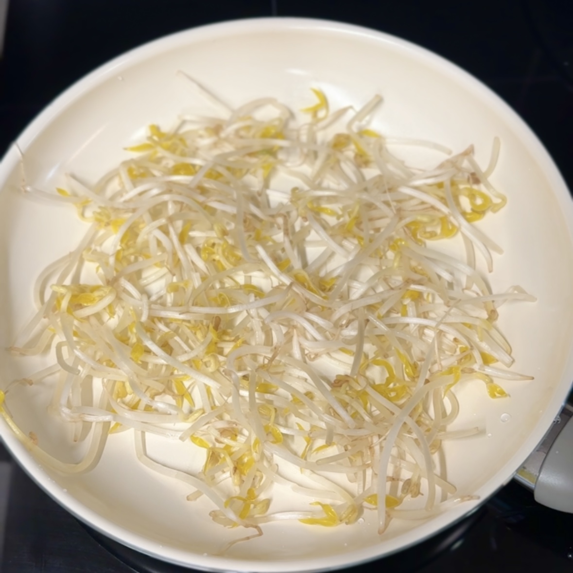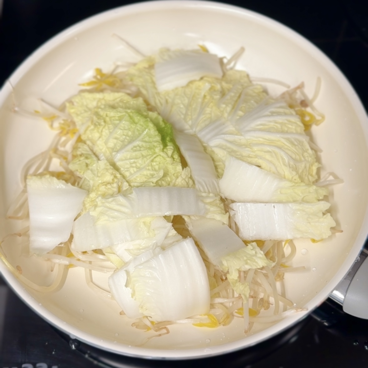 1. 제일 먼저 프라이팬에 숙주 두 줌을 깔아줍니다.