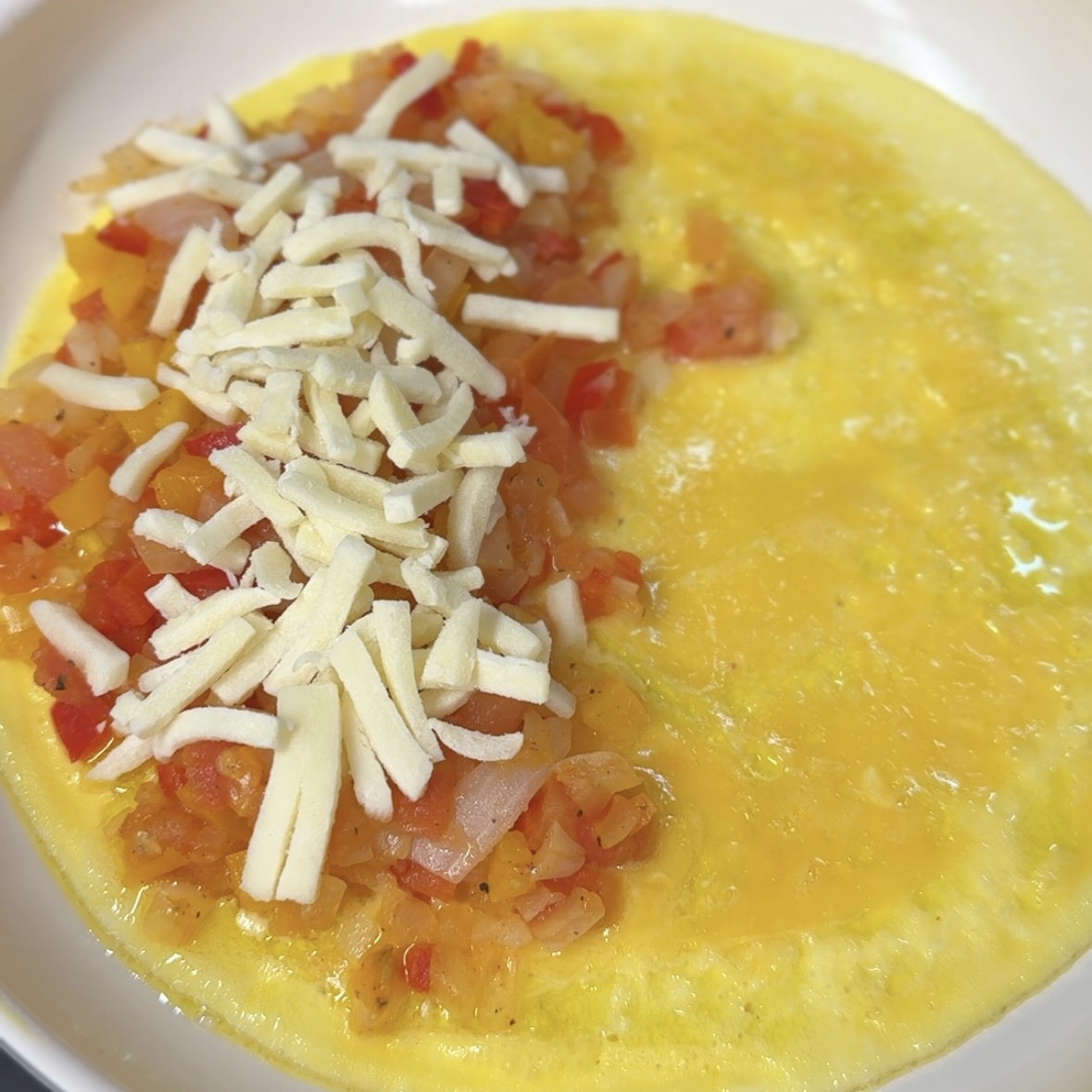 볶은 야채들과 모차렐라 치즈를 올려준다.