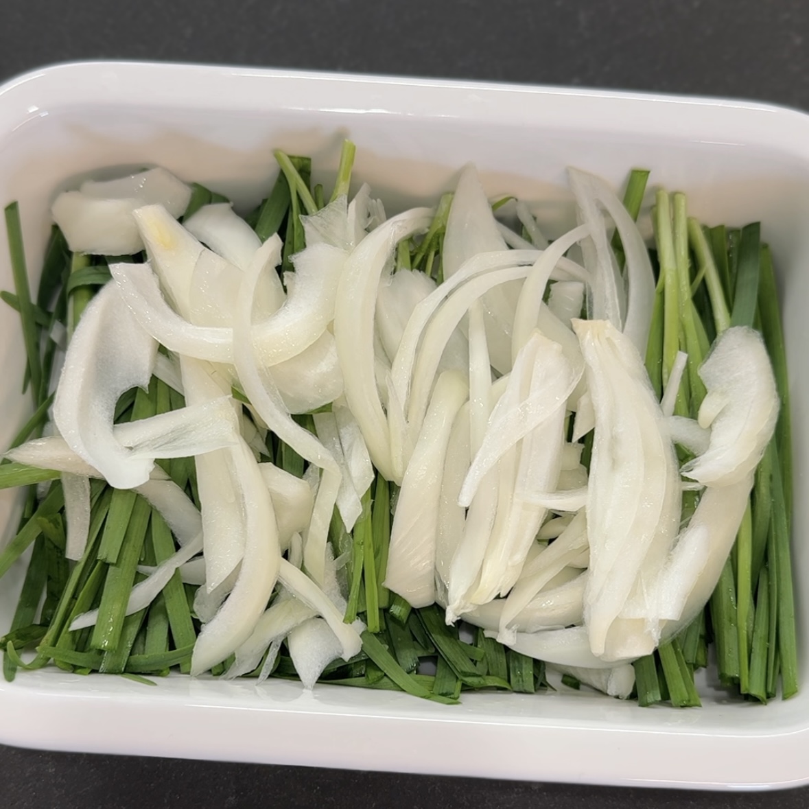 2. 양파 1/4개를 얇게 썰어 부추 위에 올려준다.