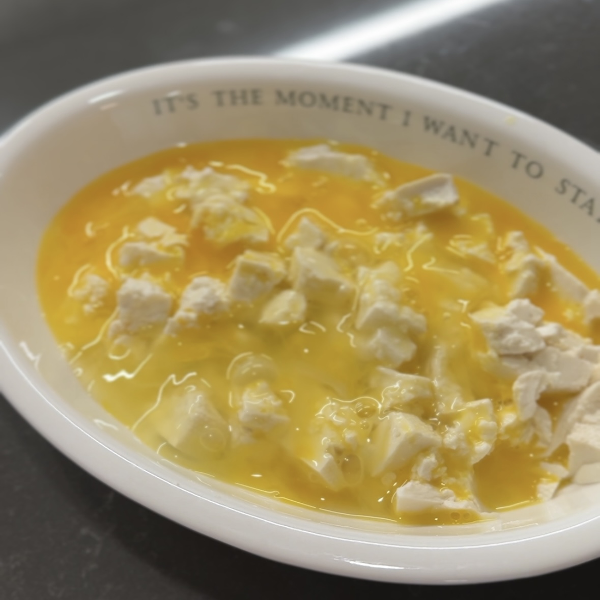 2. 계란 2개를 잘 풀어서 두부 위에 부어줍니다.